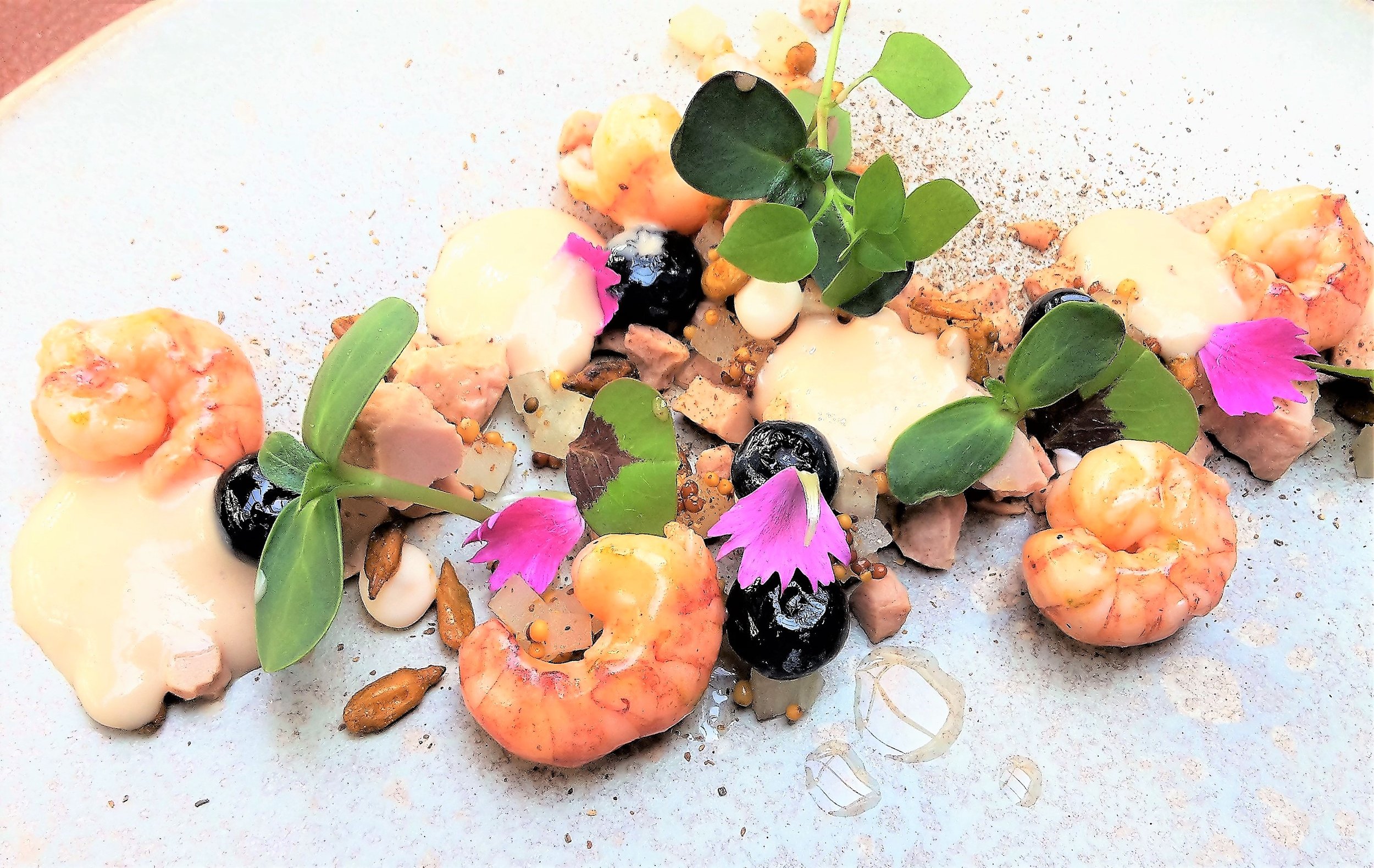 Plezier in het werk, dat próef je, het is iedere keer weer lekkerder hier. Vers brood, boerenboter, verrukkelijke amuses zoals een doorgesneden passievrucht met Hongaars spek en knapperige beekforeleitjes. Of ganzenleverblokjes met ingelegde blauwe bessen, groene kruiden en lila bloempjes. Bij rivierkreeftjes gegaard op een rokend en aan tafel getoond mengsel van gagel, een van die (on)kruidsoorten die de helaas overleden Jonnie op zijn strooptochten door de polders ontdekte. Er wordt aangename Bourgogne-chardonnay bij (Vincent Latour) bij geschonken.