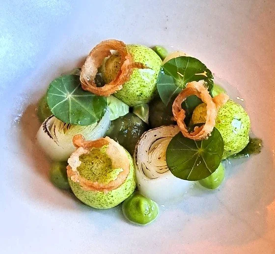 Wij schuiven aan tussen kwebbelende Vlamingen en delen hun enthousiasme over de amuse: een kopje kreeftenbisque en een gegratineerde oester. Veelbelovende voorboden.