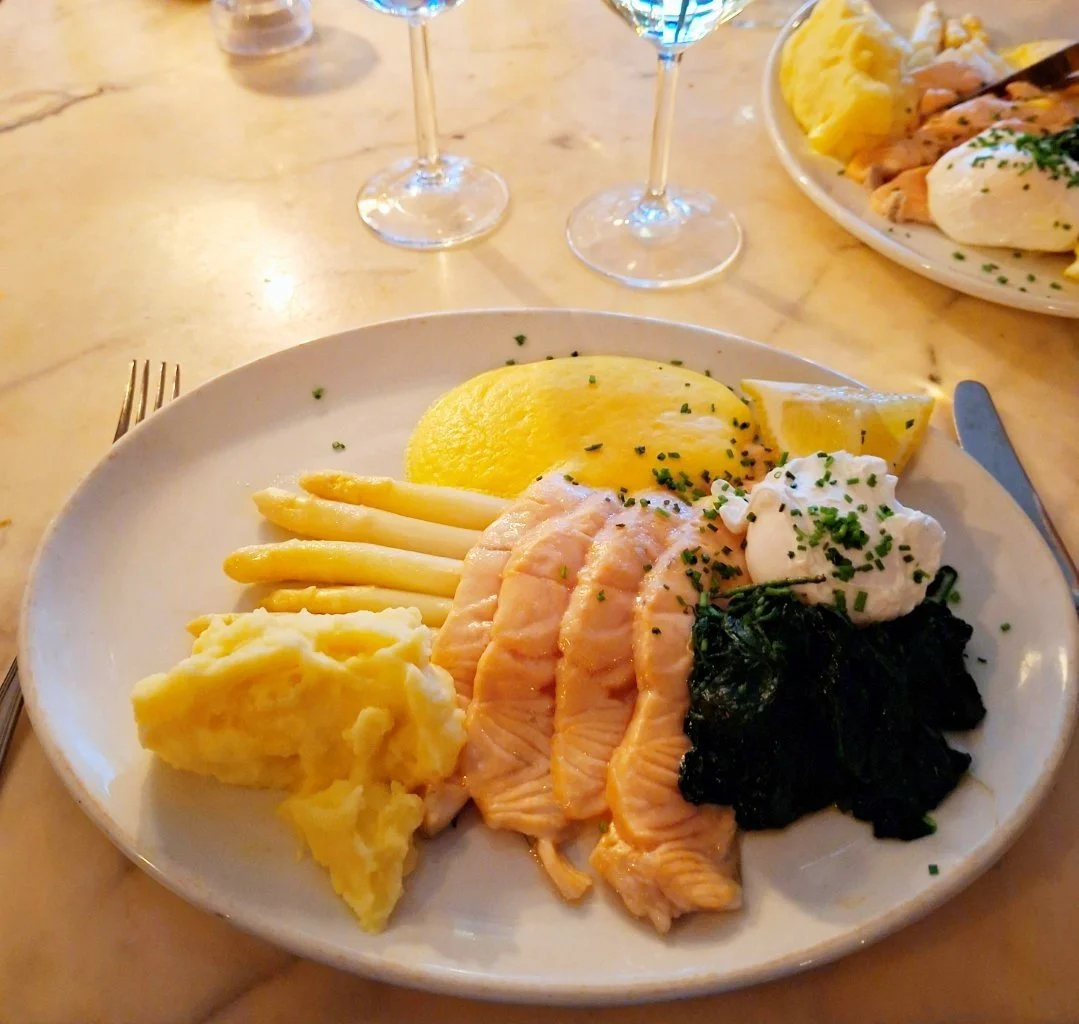 Wij proeven ‘open deurtjes’ als gravad lax en garnalencocktail, maar ook een rijke terrine van eendenlever en werkelijk verrukkelijke moules escargots: in knoflookboter gegaarde mosseltjes. Bij glazen volle chenin blanc uit Zuid-Afrika. Gevolgd door à pointe gegaarde heilbot met aardappelpuree, naast tarbot op het andere bord. Dat alles afgerond met een goed gedoseerd kaasplateau.