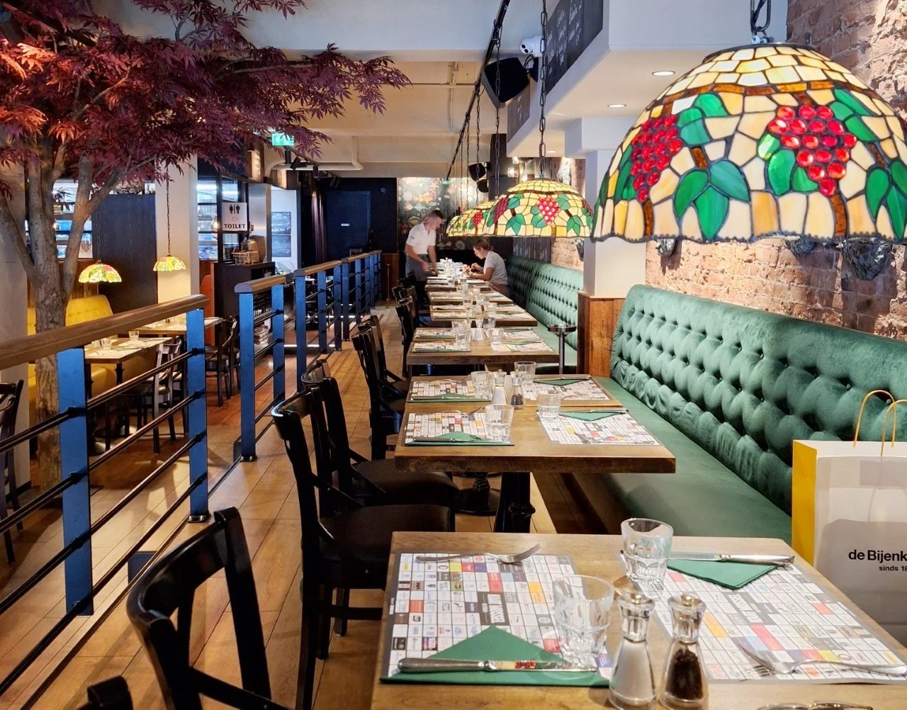 Aangenaam Parijs-achtig bistrosfeertje in de populaire Rotterdamse brasserie Kaat Mossel, van Ron en Marie-Claire Hirt. Waar iedereen elkaar kent en op voet van gelijkheid met elkaar omgaat. Normaal probeer je hier een buitenplaatsje te bemachtigen – een zéér Frans sfeertje aan dat lange terras onder de bomen – maar deze keer werkt het weer niet mee.