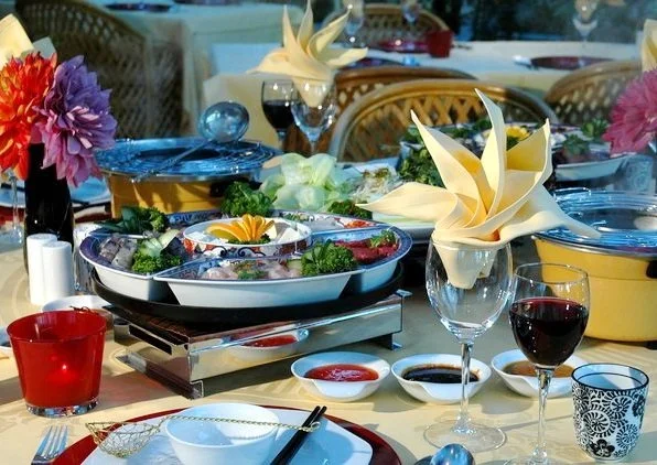 Wij drinken chardonnay van Louis Jadot (Couvent des Jacobins) bij openingshapjes als mini-loempia’s gevuld met kip, krokante pangsit goreng en gestoomde rijstdeegbuideltjes gevuld met garnalen. Gevolgd door schotels udang kelia (garnalen met Indonesische kerrie, kruiden en kokosmelk), naast ajam ketjap (roergebakken kipfilet met ketjapsaus) en krokante pekingeend in flensjes met hoi sin-saus. Heerlijke kost. En werkelijke verrukkelijk is de sizzling tenderloin van ‘sissend’ en ‘borrelend’ opgediende geroosterde ossenhaas met saus van fijngemalen zwarte peper. Dat alles besloten met zoete desserts van roomijs met vruchten.