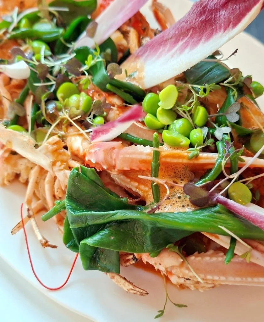 Bij een ander bezoek proeven we een combinatie van Noordzeekrab en Canadese kreeft met een garnituur van tomaat, gevolgd door een ruim bemeten schotels langoustines a la plancha, met zeekraal, krab en doperwtjes.