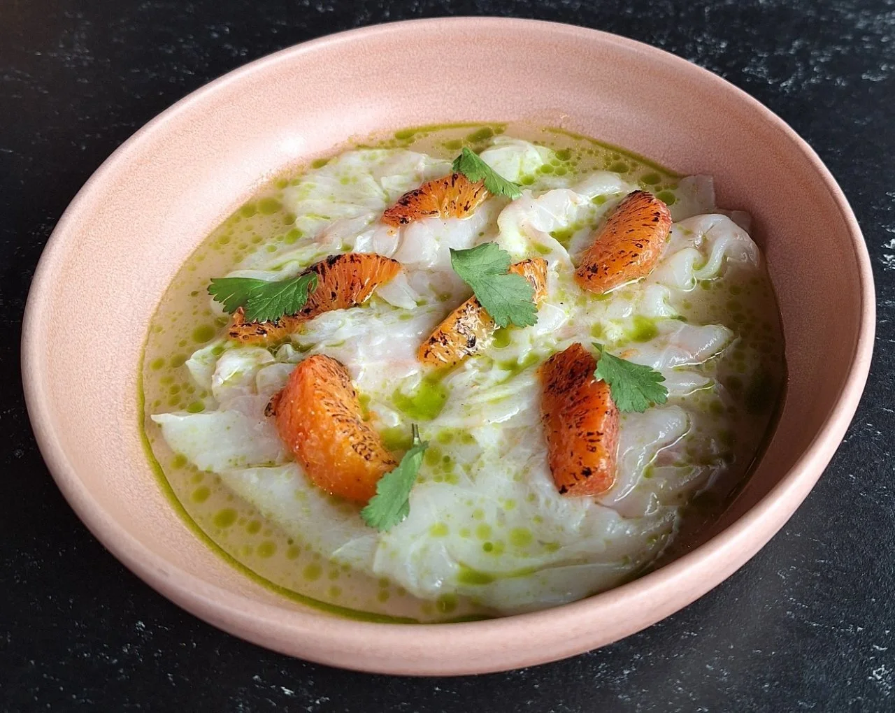 Bij een ander bezoek proeven we zacht gesudderd kalfsvlees in een saus van witte bonen en met een pikante kruidensalsa. En een dessert van gepocheerde peer met cacao en lychee.